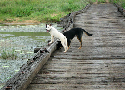 And after some frantic splashing around in the murky, muddy, weed-ridden, rat-infested water – and much laughter on my part (I am a sick, sadistic woman!) – SSB decided to rescue the adolescent canine from his own stupidity…