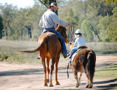 That’s better… out of the houseyard and gather up those reins as Daddy leads his darling daughter on her mighty steed off on a mustering adventure…