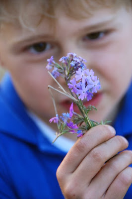 Quota! Don’t eat that pretty purple flower… it’s Blue Heliotrope. It’s a weed and it’s not good for bovines… Quota!! He’s not used to his new name yet… heh.