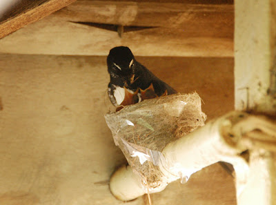 I studiously ignored the laundry and the clover, and I placed a step ladder carefully beside my laundry tubs, gingerly climbed them holding a Nikon in one hand, and hanging onto whatever curious child happened to be close-by with the other. Then, quietly hissing at said child to Be Quiet and Be Still, I patiently waited for Mr or Mrs Wagtail to come back to their cobweb and horsehair nest.