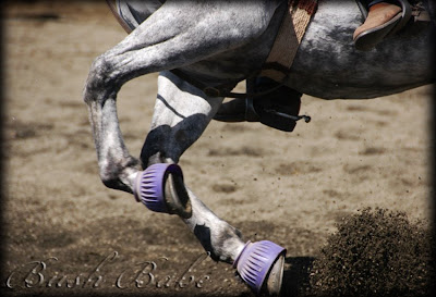 I love the purple hoof guards in the midst of all the grey of the horse and brown of the ground.